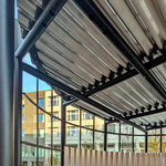 Für den Innenhof des neuen Kinderspitals in Zürich. Die Konstruktion besteht aus gewalzten Stahlelementen, die verschraubt wurden. Die Seiten sind als Rankgerüst aus Flachstahl geflochten.