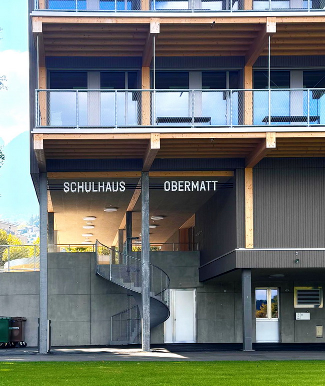 Die dreidimensionale Schrift „Schulhaus Obermatt“ ist zwischen den Balkonebenen montiert und spannt sich klar lesbar über den Eingangsbereich.